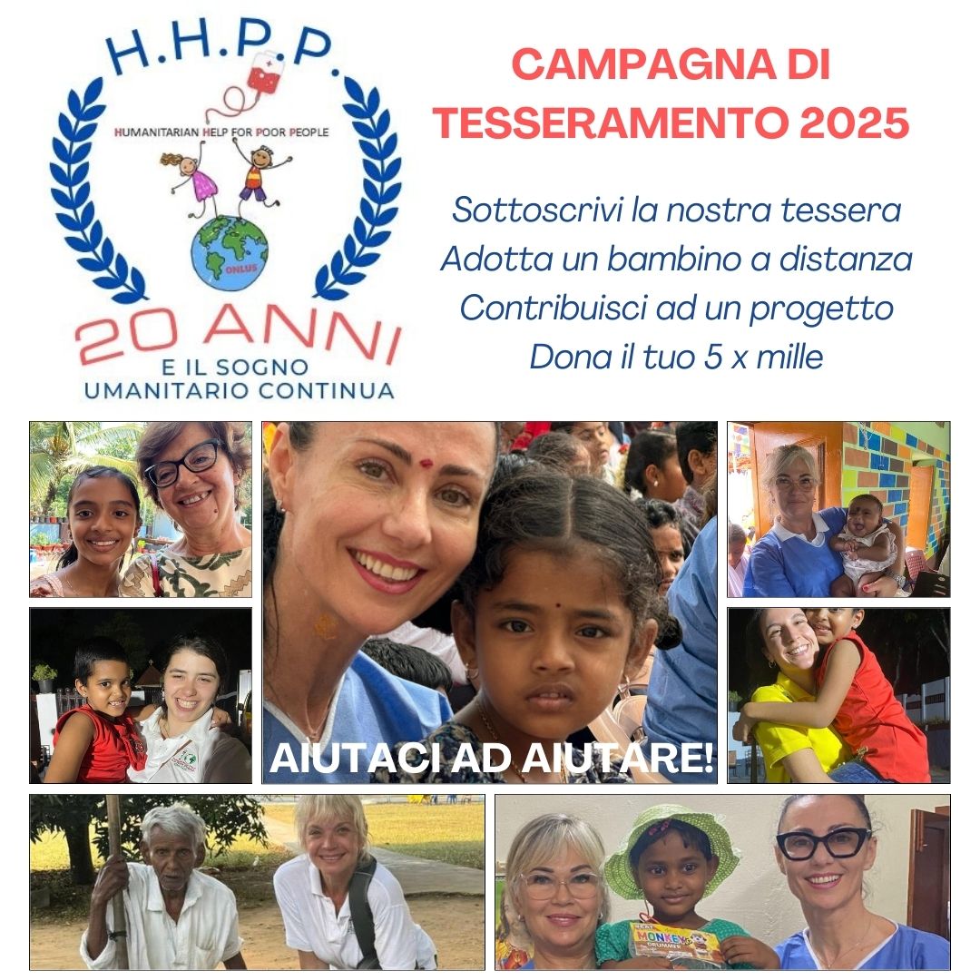 L’Associazione Humanitarian Help for Poor People H.H.P.P. Onlus nasce il 27 marzo 2003 con il solo scopo di aiutare le popolazioni più povere del Mondo portando loro aiuto sanitario, umanitario e alimentare. I soci sono esclusivamente volontari che gratuitamente offrono una parte del loro tempo per gli scopi statutari, provvedendo integralmente alle spese di viaggio e soggiorno nelle missioni sanitarie a cui partecipano. Ogni euro raccolto viene interamente devoluto per la realizzazione delle missioni sanitarie e dei progetti previsti nell’anno.