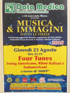 Questa sera, Giovedì 23 Agosto 2018 alle ore 21.15, si svolgerà presso il parco della Data Medica a Montecatini Terme (via della Salute, 1) l’annuale appuntamento con i concerti sotto le stelle. Si esibiranno i “Four Tunes”: Swing Americano, Ritmi Italiani e Sudamericani.