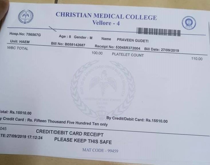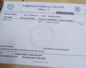 Le piastrine di Praveen sono 110.000 (normali) – Ottimo valore che conferma il completo risultato positivo della radioterapia. Adesso saranno necessari gli ultimi controlli (Risonanza Magnetica ed altri) e poi finalmente il trapianto.