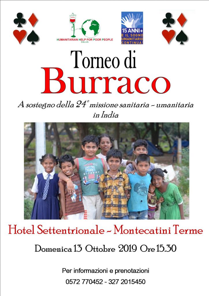 L’Associazione H.H.P.P. Onlus è lieta di invitarvi al Burraco di Solidarietà che si svolgerà Domenica 13 Ottobre 2019 alle ore 15.30 presso l’Hotel Settentrionale a Montecatini Terme (Via Grocco, 2).