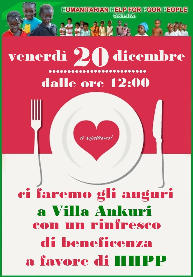 Venerdì 20 Dicembre dalle 12.00 ci faremo gli auguri a Villa Ankuri con un rinfresco di beneficenza a favore di HHPP Onlus.