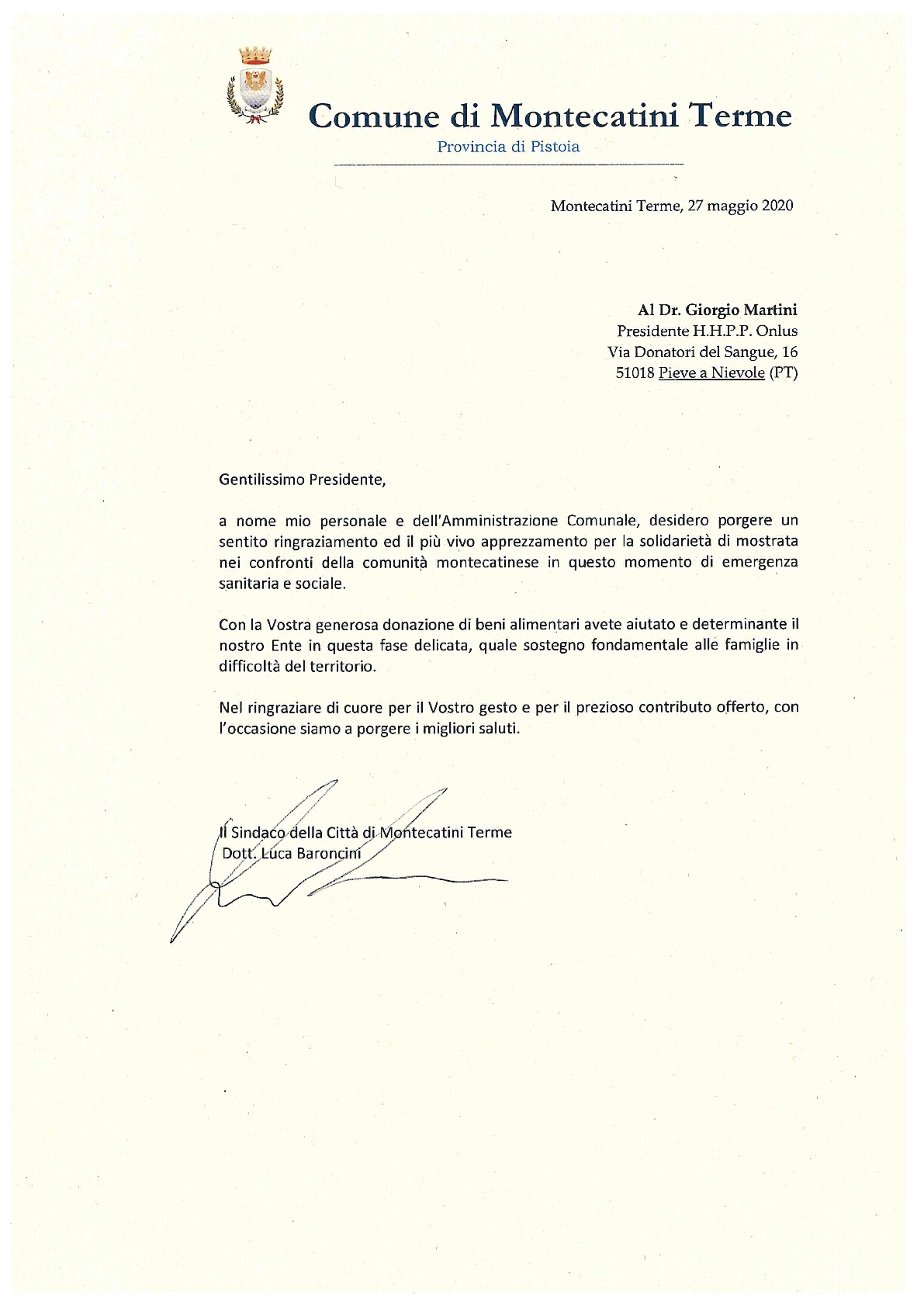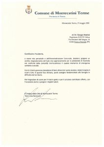 I ringraziamenti del Sindaco per la consegna dei pacchi alimentari. Siamo contenti di aver potuto aiutare tante famiglie grazie alla segnalazione dei Servizi Sociali del Comune di Montecatini Terme.