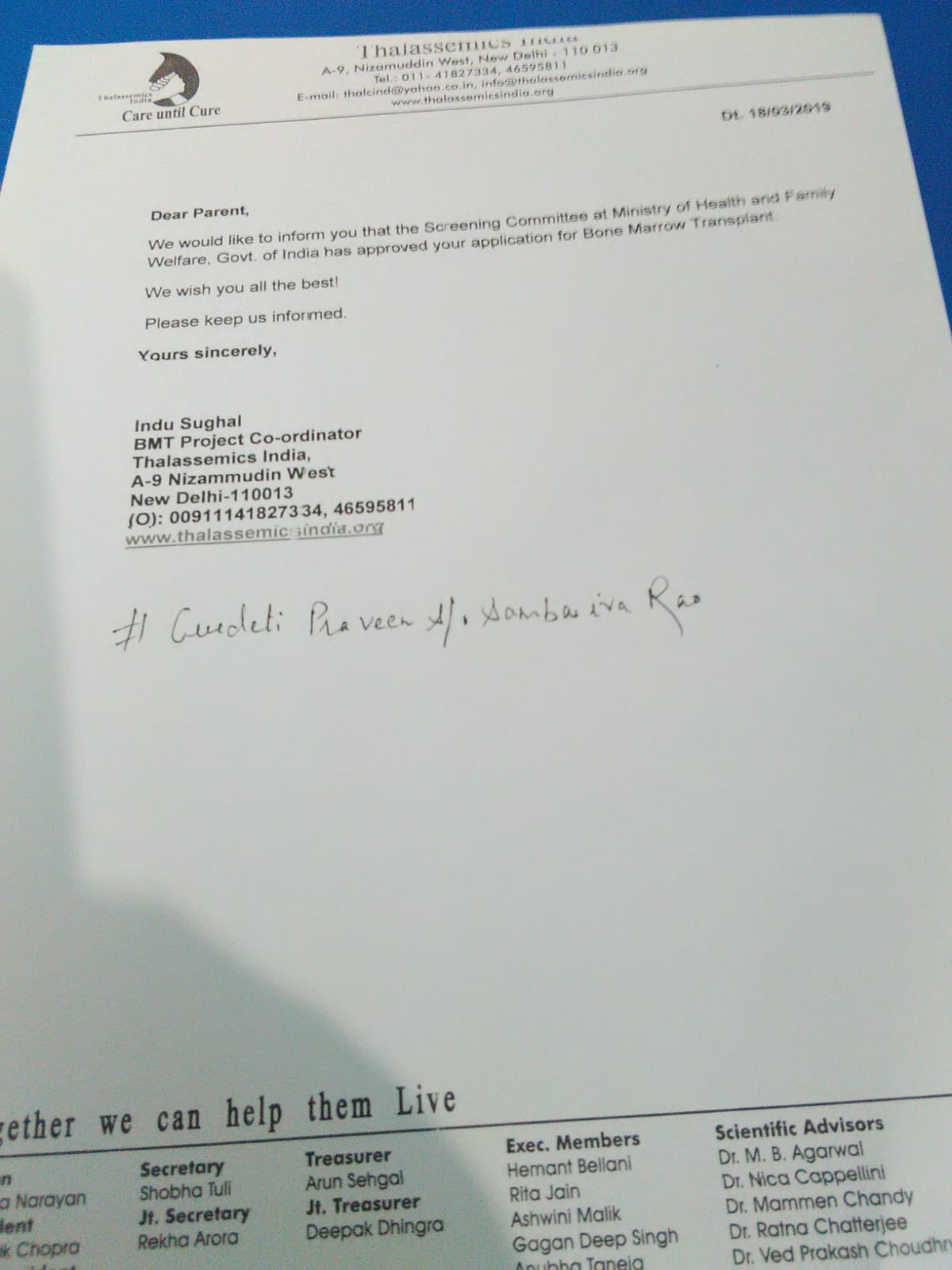 Il 21 Ottobre il bimbo è tornato a visita di controllo: la diagnosi dell’Ospedale è stata molto grave “Beta Talassemia Major” cioè grave anemia congenita per la quale necessitano continue trasfusioni di sangue a cadenza anche quindicinale. Ma c’è un però oltre alla gravità della malattia: in India le trasfusioni di sangue, così come molte delle terapie salvavita, sono a pagamento e la famiglia di Praveen, formata solo dalla nonna e dalla mamma perché il padre se ne è andato non appena conosciuta la condizione di malattia del figlio, è nella reale impossibilità di far fronte a queste continue spese.